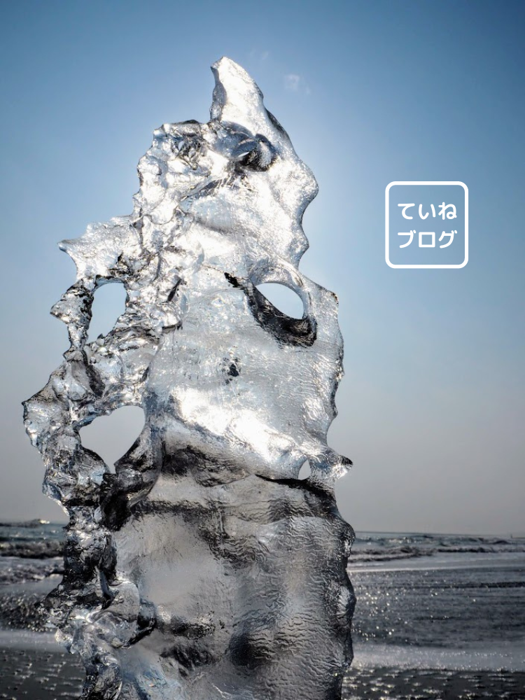 偶然できた氷の形に感激します。この写真は太陽の光を浴びているのがよくわかってとても好きです。