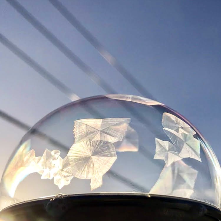 生まれた瞬間から凍り付き始めるシャボン玉。
